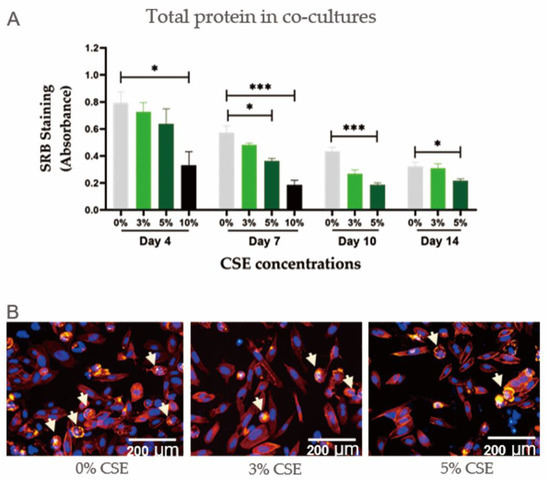 In order to evaluate the negative effects of CSE on our co-culture model, the system was exposed to CSE concentrations ranging from 0% to 10%. CSE showed a negative effect on co-culture cell viability in a dose-dependent manner (Figure 2A). CSE at a concentration of 10% was so toxic that the cell count fell by more than 50% on day 4 and 100% on day 7. CSE at a concentration of 5% also produced significant negative effects on co-cultures, although the cells did survive up to 14 days. Immunofluorescent staining confirmed the reduction in total cell numbers in co-cultures exposed to CSE (Figure 2B).
