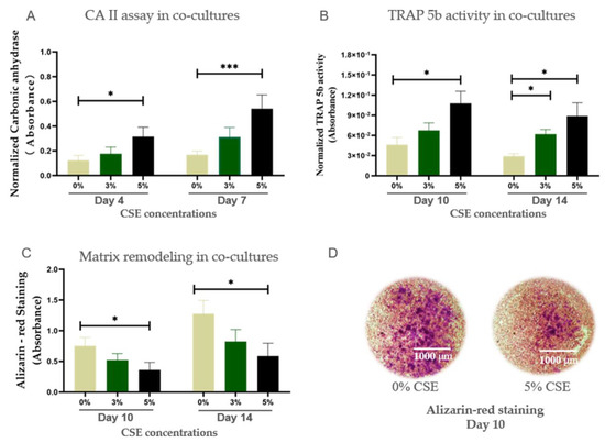 CA II is in characteristic for the early stage of osteoclastic differentiation and bone resorption [18]. Therefore, only results of CA II activity in the early time points (day 4 and day 7) are shown. TRAP 5b activity is utilized as a biochemical marker of osteoclast function [18] as well as a marker for the degree of bone resorption [19]. CSE at a concentration of 5% significantly up-regulated CA II and TRAP 5b activity in co-cultures (Figure 3A,B). Bone remodeling is associated with the resorption of mineralized bone by osteoclasts, followed by bone matrix formation by osteoblasts, which subsequently become mineralized [20]. The Alizarin red results showed that 5% CSE exposure had a significant negative effect on matrix remodeling in co-cultures (Figure 3C,D). Therefore 5% CSE was selected to use in the subsequent experiments.