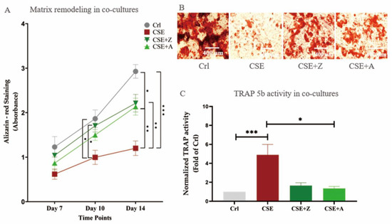 The effects of bisphosphonates (BPs) on CSE-affected cells in the co-culture of SaOS-2 and THP-1 cells. (A) Alizarin red staining of co-cultures exposed to 5% CSE with or w/o alendronate or zoledronate on day 7, 10, and 14. (B) A representative microscopy image showing Alizarin red staining of 0% CSE (Crl group) and 5% CSE group with or w/o alendronate or zoledronate on day 10. (C) TRAP 5b activity results of the co-cultures exposed to the same experimental set-up as for 7A and/B on day 7. Data are shown as the mean ± SEM, and the significance was set as * p < 0.05, ** p < 0.01 and *** p < 0.001 (N = 3, n = 3).