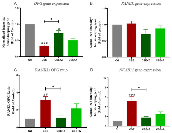 The effect of BPs on CSE-affected gene expression of osteoblastic and osteoclastic markers in the co-culture. (A) PCR of OPG gene expression in co-cultures exposed to CSE with or w/o zoledronate and alendronate on day 4. (B) PCR of RANKL gene expression in co-cultures exposed to CSE with or w/o zoledronate and alendronate on day 4. (C) The RANKL/OPG ratio of gene expression in co-cultures on day 4. (D) PCR of NFATC1 gene expression in co-cultures exposed to CSE with or w/o zoledronate and alendronate on day 4. Data are shown as the mean ± SEM, and the significance was set as * p < 0.05, and # p <0.05, ## p <0.01, and ### p <0.001 vs. Crl group (N = 3, n ≥ 2).