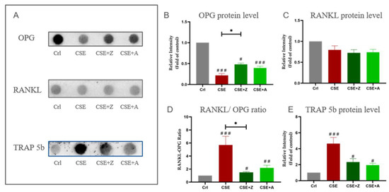 The effect of BPs on CSE-affected protein levels of osteoblastic and osteoclastic markers in the co-culture. (A) Representative dot blot images of protein levels of OPG, RANKL, and TRAP 5b. (B) Dot blot analysis of the OPG protein level in co-cultures exposed to CSE with or w/o zoledronate and alendronate on day 4. (C) Dot blot analysis of the RANKL protein level in co-cultures exposed to CSE with or w/o zoledronate and alendronate on day 4. (D) The RANKL/OPG ratio of protein levels in co-cultures on day 4. E. Dot blot analysis of the TRAP 5b protein level in co-cultures exposed to CSE with or w/o zoledronate and alendronate on day 4. Data are represented as the mean ± SEM, and the significance was represented as * p < 0.05, and # p <0.05, ## p <0.01, and ### p < 0.001 vs. Crl group (N = 3, n = 3).