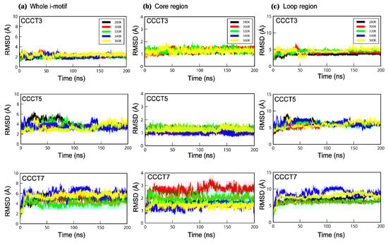 The root mean square deviation (RMSD) for hemi-protonated i-motif structures, CCCT3, CCCT5 and CCCT7 during 200 ns MD simulations under different thermal conditions; 280 K (black), 300 K (red), 320 K (green), 340 K (blue), 360 K (yellow). The first frame in each i-motif trajectory was used as the reference point for RMSD calculations. RMSD changes of atoms in the whole i-motif (a), the core region (b), and the loop region (c) are presented.