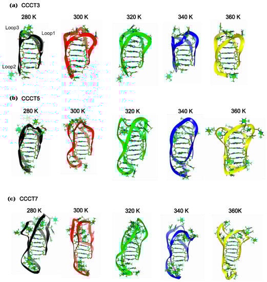 Three-dimensional representation of model i-motifs, CCCT3 (a), CCCT5 (b) and CCCT7 (c), in production run 200 ns MD simulation at five different temperatures; 280 K (black), 300 K (red), 320 K (green), 340 K (blue), 360 K (yellow). The backbone and bases are represented in ribbon and stick diagrams, respectively. Three intramolecular loops, loop1, loop2 and loop3, are indicated in the CCCT3 model (280 K).