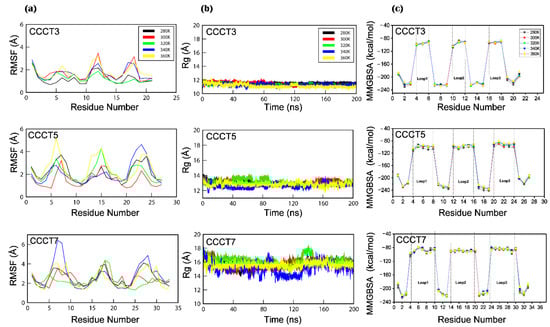 Conformal flexibility of the model i-motifs. (a) The per residue root mean square fluctuation (RMSF) of each residue of the model i-motif structures, CCCT3, CCCT5 and CCCT7, in production run of 200 ns MD simulation are displayed. (b) Changes of the average radius of gyration (Rg) for the hemi-protonated C:C+ base-pairing are displayed during 200 ns molecular dynamics simulation. (c) Molecular Mechanics Generalized Born Surface Area (MMGBSA) binding free energy are plotted per residue. RMSF, Rg and MMGBSA values of model structures obtained during the MD simulation under five thermal conditions, 280 K (black), 300 K (red), 320 K (green), 340 K (blue), and 360 K (yellow) are displayed in different colors.