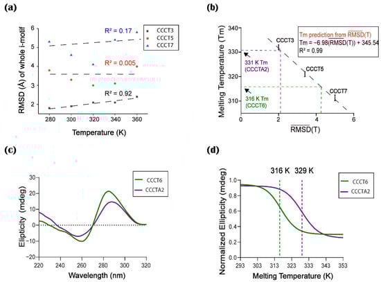 To further test if the TR plot can be used for estimating the thermal stability of any unknown i-motif, we introduced two additional i-motifs: CCCT6, an i-motif with T6 in all three loops, and CCCTA2, an i-motif found in human telomeres with a TAA loop [39]. In the same way as the previous model i-motifs, the s of CCCT6 and CCCTA2 were calculated based on the MD simulation for 200 ns at five different temperatures. The s of CCCT6 and CCCTA2 are 4.1 Å and 2.1 Å, respectively (Table 2). By applying these values on the TR plot, Tm values were estimated to be 316 K and 331 K for CCCT6 and CCCTA2, respectively (Figure 5b). We then measured the Tm values by experimental CD analysis (Figure 5c,d). Tm values of CCCT6 and CCCTA2 were 316 K and 329 K, respectively (Figure 5b). Therefore, these results confirmed that the estimated Tm value of CCCT6 is well matched to the experimentally determined Tm. In the case of CCCTA2, although the Tm value was not exactly predicted, the estimation is very close to the actual value. These results suggest that the TR plot is useful to predict or estimate the Tm value that represents the structural stability of the i-motif.