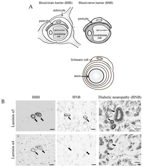 Peripheral nerve tissues mainly compose the BNB, Schwann cells, and nerve axons. The BNB is mainly localized in the microvessels of peripheral nerves within the peripheral neural parenchyma (endoneurium) and consists of vascular endothelial cells bound by tight junction proteins, pericytes attached to the outer side of the vascular endothelial cells, and basal laminae covering these two types of cells. Like the blood–brain barrier (BBB) in the central nervous system, the BNB acts as a wall preventing the influx of harmful substances circulating in the blood into peripheral nerves [6]. The BBB is mainly composed of brain microvascular endothelial cells, pericytes, astrocytes, and the two distinct basement membranes. The BNB has a similar structure to the BBB, with the exception of lacking astrocytes (Figure 1A). It had previously been thought that the BNB was leaky compared to the BBB, as a result of the lack of astrocytes, but several reports showed that the BNB has a barrier function as robust as that of the BBB [7,8] and acts as an interface to maintain the microenvironment in peripheral nerves by expressing transporters for the transportation of nutrients, such as glucose and amino acids, as well as for the excretion of waste products [6,9]. The basement membrane in the BBB and BNB consists of a mixture of extracellular matrix proteins including collagen IV and laminin [10]. Laminin is a trimeric molecule comprising α-, β-, and γ-subunits and shows specific expression in the central and peripheral nervous systems [10]. We showed that laminin α4 was hardly expressed in the BNB compared with the BBB (Figure 1B), whereas α5, β1, β2, and γ1 were widely expressed in the BBB and BNB [11]. In experimental autoimmune encephalomyelitis, a relevant preclinical model of multiple sclerosis laminin α4 facilitates the transmigration of T lymphocytes across the BBB because integrin α6β1, a major counterpart receptor of laminin α4, is strongly expressed on all T lymphocytes [12]. These results showed that T lymphocytes, with integrin α6β1, migrated across the BNB through other factors (except for laminin α4 in peripheral autoimmune neuropathies), suggesting the BNB has its own barrier system because of a lack of laminin α4 in the BNB. On the other hand, laminin α5 plays a key role in the maintenance and repair of BBB after hypoxic injury and inflammation [13]. Therefore, we hypothesized that BNB-specific laminin expression without laminin α4 might promote almost the same properties as a barrier system as those with the BBB.