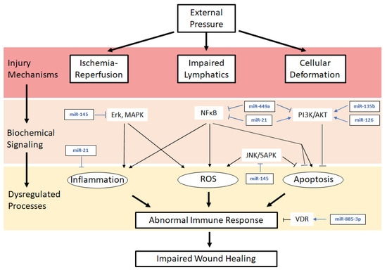 Pathophysiologic mechanism of pressure ulcers and current understanding of miRNA regulation. Ischemia-reperfusion, lymphatic channel obstruction, and cellular deformation result in elevated inflammation, ROS, and apoptosis, which contribute to immune response dysregulation and impaired wound healing. Flat head arrows indicate inhibition, pointed arrows indicate activation.
