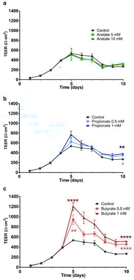 2.2. The Effect of SCFA on the Development of the Barrier Integrity of 16HBE Cells