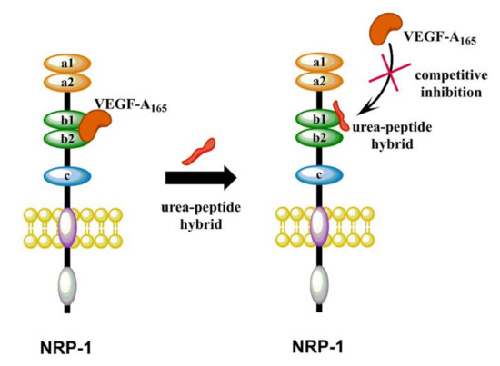 Schematic cartoon representing the VEGF-A165/NRP-1 complex formation inhibited by synthesized urea–peptide hybrids.