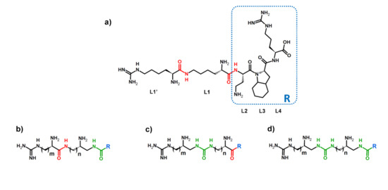 Identifying sites for the hydrolysis of the compound by proteases is one of the steps for the rational design of peptidomimetics. It can indicate parts of the molecule that need chemical modifications to increase the biological stability of the compound. Our aim was to design enzymatically stable, short and branched peptidomimetics, based on our previously described Lys(hArg)-Dab-Oic-Arg sequence, which exhibits highly competitive inhibition of NRP-1/VEGF-A165 complex formation [44]. Lys(hArg) branching is crucial for obtaining high affinity to NRP-1 receptor, but undergoes enzymatic hydrolysis primarily. Considering that a urea moiety might enhance stability and provide additional hydrogen bond donor through an extra –NH– group, which may generate additional interactions sites with target, it could be considered as a beneficial peptide bond surrogate [74]. However, such a replacement might also affect a compound’s inhibitory activity. Our previous studies showed that the substitution of Lys-ε-hArg amide bond by urea group and replacement of hArg with shorter Arg side chain made peptidomimetics more resistant to enzymatic cleavage, but it also affected the affinity for NRP-1. The inhibitory activity of the most potent Lys(hArg)-Dab-Oic-Arg peptide (IC50 = 2.3 µM) [44] decreased about two-fold due to introduction of urea bond (IC50 = 5.5 μM) [45]. Lower inhibitory activity might be related to N-terminus branching elongation, as urea moiety changed the number of atoms in the chain, thereby suggesting further refinement of Lys(hArg) part. The applied combination of building blocks provides the same branching length as present in the Lys(hArg) fragment of parent sequence but modifies the position of individual residues and the location of the urea bond. Three different strategies were envisioned (Figure 2a) and the following sites were modified: between the carboxylic group of Lys (L1) and α-amino group of Dab in L2 (Figure 2b); between the carboxylic group of hArg (L1′) and ε-amino group of Lys in L1 (Figure 2c); in both sites simultaneously (Figure 2d).