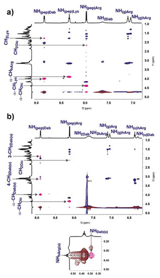 2D NMR spectra were recorded to get an insight in to the structure of parent peptide and urea–peptide hybrid 6 in solution. Both compounds were dissolved in DPBS buffer with 10% addition of D2O. Signals were assigned based on TOCSY, COSY and HSQC spectra (Figures S46–S50 and S52–S56). The analysis of ROESY spectra (Figure 3) indicated that both compounds exhibited very similar patterns of NOE connectivities. Most of ROESY signals overlapped perfectly well with the correlations observed at TOCSY (Figures S51 and S57); therefore, they reflected interaction only within one residue. For both compounds, we observed strong NOEs between sequential α-CH/NHpep protons and weak NOEs between some NHpep and CH2 protons of neighboring amino acid residues in the branching (Figure 2). Any medium-range NOEs were not detected. All these observations indicated that parent peptide and hybrid 6 adopted quite similar extended and unstable conformations in solution [86]. It is also interesting to mention that NOE connectivity between protons of urea moiety in hybrid 6 was observed (Figure 3b), which may suggest trans/trans conformation of this urea group. NMR studies of the structure of the parent peptide and hybrid 6 in solution did not provide any explanation about differences in inhibitory activity against VEGF-A165/NRP-1 complex formation.