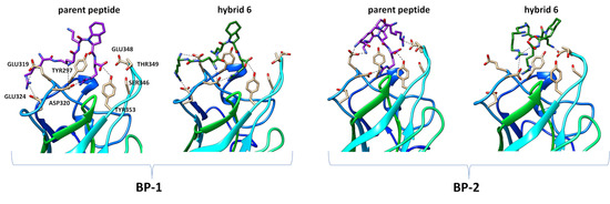 A summary of the observed interactions of both molecules in each run can be found in Supplementary Materials (Figure S72). A visual representation of binding poses is presented in Figure 4 with snapshots extracted from simulations. The most notable difference is in interactions of hArg free amino group and urea moiety. In majorly present binding pose 1 (BP-1) both molecules could be described as “spread”, similar to their 2D drawing. For the parent peptide, the guanidinium group of hArg interacts with Glu319 and Glu324. N-terminal amine interacts through hydrogen bonding with Asp320, and other positively charged groups are directed outside of the protein (Figure 4). In the case of hybrid 6, the urea moiety forms hydrogen bonds with Glu319 and “wraps” the molecule around this region, as at the same time interactions between free amino groups of hArgU with Glu319 and Dab (L1) with Glu319 or Asp320 are also observed. The guanidinium group of hArgU either forms interactions with nearby Glu324 or is exposed to solvent (Figure 4).