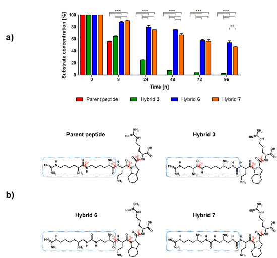 (a) Comparison of the in vitro metabolic stability of parent peptide and its urea–peptide hybrids 3, 6 and 7. Results are presented as the means ± SEMs of three independent experiments on LCMS (N = 3). In order to show significant differences in the concentration of intact substrate at each time interval depending on the sequence of the hybrid, a two-way ANOVA with Bonferroni’s post-tests was done (** p < 0.01, *** p < 0.001). (b) Potential bonds cleaved by enzymes (scissors show identified proteases cleavage sites).
