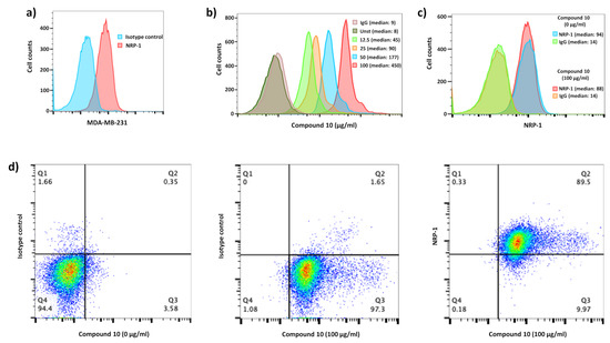 VEGF-A165 binds to cell-surface NRP-1 on endothelial cells, effectively reducing surface levels of this receptor, promoting complex internalization and possibly inducing biological effects [91]. Based on this mechanism, peptide carriers for selective drug delivery, such as iRGD peptides, have been recently disclosed [57]. The iRGDs are used to selectively address potential therapeutic agents, e.g., doxorubicin or siRNAs inside malignant cells. We tested our tagged urea–peptide hybrid’s ability to bind human NRP-1-positive breast cancer cells (MDA-MB-231), which expressed large amount of NRP-1 at the cell surface (Figure 6a). A broad range of concentrations between 0 to 100 µg/mL of compound 10 was used to show its binding capacity on cells using fluorescence-activated cell sorting (FACS). As shown in Figure 6b, binding on cells was dose-dependent. To follow the impact of the ligation of this peptidomimetic on NRP-1 expression, we verified whether hybrid 10 binding interferes with the antibody used to detect NRP-1. As we can observe in Figure 6c, the presence of compound 10 did not interfere with the NRP-1 detection (94 vs. 88 of median fluorescence intensity, respectively), allowing us the study of NRP-1 regulation in presence of these inhibitors. Finally, we performed co-staining (hybrid 10 and NRP-1 staining) to determine the ability (percentage) of NRP-1-positive MDA-MB-231 to bind compound 10. All cells were able to bind our labeled hybrid and then all of these cells expressed NRP-1 (Figure 6d middle and right panels, respectively). In conclusion, we could follow the expression of NRP-1 by MDA-M-231 exposed to compound 10 using co-staining.