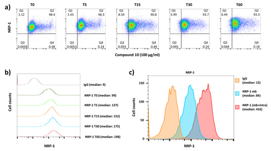 Usually, in the presence of its natural ligand, a transmembrane receptor at the cell surface may induce signaling, internalization of complex and recycling at the cell surface. In contrast, some drugs, e.g., blocking antibodies, may induce internalization of antibody-receptor complex and receptor recycling or internalization with an intracellular sequestration, as we previously showed in anti-human transferrin receptor (anti-Tfr) therapy development [92]. Thus, to identify the mechanism of action of the hybrid 10 on the NRP-1 expression on cells, we followed its expression after a time course exposure of cells at 37 °C. Independently of time exposure, the results prove the presence of compound 10 bound with cells (positive from 5/6-FAM-labeled peptide) with no downmodulation of NRP-1 expression (Figure 7a), as we observed strong signal from the stained receptor at each time interval. This might suggest the incapacity of hybrid 10 to induced downmodulation of NRP-1 by cells or its internalization, since only NRP-1 cell surface expression was followed. This intriguing result focused our attention on tracking the level of expression intensity of NRP-1 on the surfaced of MDA-MB-231 cells exposed on compound 10. Surprisingly, the NRP-1 level expression, in a time-dependent manner, was rapidly increased at the cell surface. The median fluorescent intensity after 1 h (T60) of cell exposure on hybrid 10 was 1.5-fold higher than after 5 min of incubation (Figure 7b). This upregulation of NRP-1 expression could not be explained by a neo-synthesis of NRP-1 from mRNA, which requires more time, but only by the induction of endogenous stock trafficking of intracytoplasmic NRP-1 reserve toward the cell surface. This hypothesis is strengthened here, since MDA-MB-231 expressed a large amount of NRP-1 at the cell surface, but also had plenty of the cytoplasmic counterpart, reaching a maximum of median fluorescence intensity higher than the restricted level of NRP-1 expression at the surface (Figure 7c).