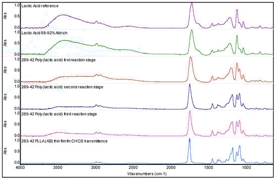 The progress of lactic acid polycondensation reaction can be followed also by infrared spectroscopy in addition to ORD spectroscopy. As shown in Figure 2, the FT-IR spectra (from top to bottom) show a gradual decrease of the intensity of the hydroxyl stretching band at about 3450 cm−1 with the progress of the polycondensation reaction. This is logical since less OH groups are present in the reaction mixture by increasing the degree of polymerization. Indeed, the OH groups are almost no more detectable in the case of the high molecular weight PLLA.