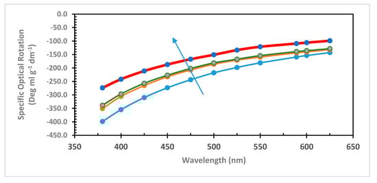 Optical rotatory dispersion (ORD) of poly(lactic) acid oligomers (PLAO) at different degrees of oligomerization. The arrow shows the growth in optical activity as function of the molecular weight increase, starting from the ORD curve of 90% l-(+)-lactic acid (neat, light blue dots at the top of the figure) to a high molecular weight poly(l-lactic acid) (PLLA) dissolved in CHCl3 (1.50 g/100 mL; dark blue dots at the bottom of the figure). The ORD curves of the PLAO oligomers were recorded in acetone solvent, with the exception of the last curve in yellow dots, which required the use of CHCl3 solvent (in all cases, 1.50 g in 100 mL).