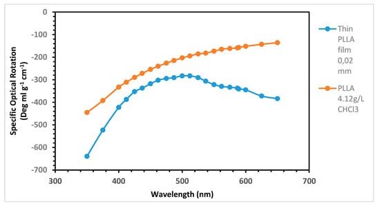 High molecular weight PLLA dissolved trichloromethane shows a negative plain ORD curve (Figure 4) in the spectral range between 350 and 650 nm of since the peak due to the Cotton effect associated with the n → π* transition of the ester chromophore of PLLA occurs at about 210–220 nm with a trough at 275 nm and a crossover at 240 nm []. Indeed, the PLLA absorption maximum due to the ester the n → π* electronic transition was measured at 209.8 nm on a 35 μm thin film [,]. Figure 4 shows also the ORD curve of a thin PLLA solid film. The thickness of the film was measured through the fringing effect method [], while the specific optical rotation was calculated with a modification of Equation (1), as follows: