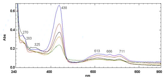 Figure 6 (blue line) shows the electronic absorption spectrum of a pristine green thin PLLA film (30 μm thick) recovered from a used water bottle. PLLA is completely transparent in the visible and in the UV-A and UV-B spectral range. In fact, the main PLLA electronic transition occurs at 209.8 nm in the UV-C spectral window and is due to ketone band of the ester group [,]. Thus, in Figure 6, the main absorption band at 438 nm is due to the pyrazolone dye SY93 with a bright yellow color. On the other hand, the electronic absorption spectra of phthalocyanines are known in great detail [,,]. The electronic transition at 325 nm in Figure 6 is the Soret, or B-band, which is always accompanied by the Q bands which, for PB16, appear at 613, 666, and 711 nm [,,].