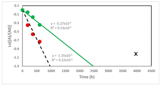 Kinetics of dyes bleaching inside the PLLA film (30 μm thick) exposed to ozone; ozonolysis of SY93 with kdec = 1.35 × 10−3 h−1 (absorbance at 438 nm, red dots and black dotted line); the asterisk shows the value of Ln[(A/A0)438] after 4000 h exposure to ozone and not included in the determination of the SY93 ozonolysis rate constant; ozonolysis of PB16 with kdec = 5.27 × 10−4 h−1 (absorbance at 711 nm, green dots and line).