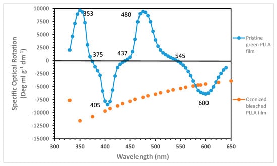 The most intriguing result of this paper is certainly the ORD measurement made on the green thin PLLA film from used water bottles reported in Figure 8 showing a multiple Cotton effect with a certain degree of complexity, while the ORD curve of a transparent PLLA thin film is just a plain negative curve, as shown previously in Figure 4. The multiple Cotton effect in the green PLLA film is due to an extrinsic Cotton effect derived from the interaction of the helical structure of PLLA in the solid state and the two dyes SY93 and PB16 [], as well as the mutual interaction of the two dyes in a chiral environment represented by the PLLA matrix in the solid state []. Similar extrinsic Cotton effect, but with considerably smaller ORD amplitude and complexity, has been detected also in our earlier works dealing with PLLA-iodine and PLLA-C60 complexes [,]. Figure 8 shows also that the multiple Cotton effect observed in the ORD of the green PLLA film vanishes completely as soon as the two dyes SY93 and PB16 are decomposed into other not colored products after exposure of the PLLA film to ozone, demonstrating that the two dyes are the key source of the complex ORD spectrum of Figure 8. After the ozone treatment, the new ORD curve on PLLA film shows a plain negative trend with a through at about 350 nm and a peak beyond the spectral range accessible to our spectropolarimeter. Thus, a new Cotton effect in the ozonized PLLA film occurs below 300 nm and is due to the ozonolysis products of the dyes SY93 and PB16, which remain trapped in the bleached PLLA film.