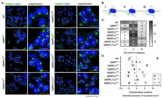 To investigate the impact of individual GABARAP family members on Golgi morphology, we used a panel of human embryonic kidney 293 (HEK293) KO cell lines which exhibit a single KO (SKO), a double KO (DKO) combination, or a triple KO (TKO) of the respective GABARAP-type protein gene locus [26,27]. Golgi morphology was studied via visualisation of both the TGN by anti-TGN46 staining (Figure 1A) and the complete Golgi by BODIPY-FL C5-ceramide staining (Supplementary Figure S1). For both markers, consistent patterns for each of the analysed cell lines were observed, cross validating the observed results. Next, because of its more distinct staining profile, we categorised the signal obtained for TGN46 as compact (I), partly compact (II), and dispersed (III) Golgi pattern (Figure 1B), technically always considering all individual planes of each recorded z-stack during analysis. As summarised in Figure 1C, the vast majority of the stains from WT cells, expressing all three GABARAP-type proteins, were classified as category I or II. Hence, WT cells had a compact or partly compact Golgi morphology in most of the cases (46% and 39%, respectively), while category III patterns indicating extensive Golgi fragmentation were rare. Cells with a GABARAPL1SKO displayed only mild alterations with a slight tendency towards lower Golgi compactness, but overall showed the most WT-like phenotype of all genotypes analysed. In contrast, both GABARAPSKO and GABARAPL2SKO cells showed category I patterns in less than 20% of the cases, and more than 60% the fraction of category II was considerably increased compared to WT. However, the percentage of category III was similar between all the three SKO lines and thus also resembled the WT situation. While SKO-like results were obtained for GABARAPL1/L2DKO cells, GABARAP/L1DKO cells showed a further reduction of category I (to 8%), accompanied with an increase of category II (to 71%). Strikingly, 36% of the GABARAP/L2DKO cells exhibited even more category III Golgi structures than GABARAP/L1/L2TKO cells (33%) and thus displayed the highest degree of disorganisation among all genotypes (Figure 1C). Overall, there was a significant association between the genotype analysed and Golgi compactness as calculated by Pearson’s chi-squared test (χ2 (14) = 414.62, p < 0.001). Based on the obtained standardised residuals (Figure 1D), which represent the standard deviation of the actual from the expected count, lack of GABARAP or GABARAPL2 alone or in combination with a lack of GABARAPL1 was associated with a shift from a compact to a more dispersed Golgi morphology. Strikingly, GABARAP/L1DKO cells specifically showed an enrichment of partly compact Golgi morphology, whereas GABARAP/L2DKO and GABARAP/L1/L2TKO cells showed an enrichment of dispersed Golgi morphology. The representative 3D visualisations of the recorded confocal stacks after TGN46-staining can be found in Supplementary Figure S2. Consistently, also staining of the cis-Golgi marker protein GM130 (Figure S3A), followed by the categorization as applied for TGN46 staining (Figure 1), revealed a shift from compact to partly compact and completely dispersed Golgi morphology in GABARAP/L2DKO and GABARAP/L1/L2TKO cells compared to WT (Figure S3B,C). The same was true for another marker of cis-Golgi, Golgi reassembly-stacking protein of 65 kDa (GRASP65), which was analysed accordingly (Figure S3D–F). Taken together, these results indicate that besides GABARAPL2, at least also GABARAP seems to be involved in Golgi maintenance.