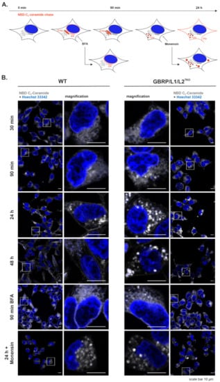 The ceramide chase experiment was conducted according to [29]. Briefly, HEK293 Flp-In T-REx cells (3 × 105) were seeded into fibronectin-coated 35 mm imaging dishes (Cat. No. 81158, ibidi, Gräfelfing, Germany) and cultured for 24 h in phenol red-free DMEM (Cat. No. 21063029, Thermo Fisher Scientific) supplemented with 10% FCS. Fluorescent NBD C6-Ceramide, Cat. No. N1154, Thermo Fisher Scientific, Waltham, MA, USA) was dissolved in 95% ethanol to a stock concentration of 1 mM. Cells were labelled with 10 nmol/mL NBD C6-Ceramide in Hanks’ Balanced Salt Solution (Cat. No. 14025050, Thermo Fisher Scientific, Waltham, MA, USA) containing 0.68 mg/mL bovine serum albumin (BSA) for 1 h at 4 °C in the dark. After labelling, the medium was aspirated, and the cells were rinsed two times with HBSS and further incubated at 37 °C and 5% CO2 for 30 min, 90 min, 24 h, and 48 h. As inhibitors of Golgi function, Brefeldin A (Cat. No. 00-4506-51, Life Technologies, Carlsbad, CA, USA) and Monensin (Cat. No. 00-4505-51, Life Technologies, Carlsbad, CA, USA) were used at a concentration of 10 µM each. Cells were incubated with Hoechst 33342 (Cat. No. R37605, Invitrogen, Carlsbad, CA, USA) according to the manufacturer’s instructions for nuclei staining.