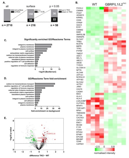 Among all differentially abundant surface annotated proteins, a gene ontology (GO)/reactome pathway enrichment analysis revealed, among others, significant over-representation of proteins belonging to the category of sodium ion membrane transport (−log10 p = 3.18, 37.8-fold,) and cell adhesion (−log10 p = 1.41, 6.7-fold) as given in Figure 3C,D, respectively.