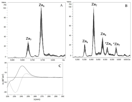 Both PbrMTs rendered mixtures of several species when synthesized in culture media enriched with ZnCl2 (Table 1; Figure 3). In particular, these mixtures consisted of Zn8- (major) and Zn7- complexes for PbrMT1, and Zn7- (major), Zn8- and Zn6- complexes for PbrMT2. Concordantly, these results match those obtained by ICP-AES (Table 1), and although PbrMT2 has one Cys more than PbrMT1 (23 vs. 22 Cys), both MTs rendered similar metallated species. However, and despite the degree of heterogeneity in speciation of the Zn-PbrMT1, preparation is lower than that of Zn-PbrMT2, the latter shows a higher folding degree with an exciton coupling at ca. 240 nm in the CD spectra in front of the simple Gaussian band at the same wavelength recorded for the Zn-PbrMT1 preparation (Figure 3C).