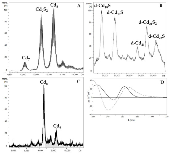 The recombinant synthesis of PbrMT1 and PbrMT2 in cultures supplemented with CdCl2 also rendered a mixture of species (Figure 4), as in the case of the Zn productions. The difference between the conventional ICP values and the acidic ones in both productions (Table 1), as well as the presence of CD bands with maxima at wavelengths higher than 255 nm (Figure 4D) clearly indicate the presence of additional Cd-S2− chromophores [3,33]. On the one side, PbrMT1 rendered Cd8- and Cd7S2- as major species, together with minor Cd7-PbrMT1 (Figure 4A). On the other hand, PbrMT2 yielded dimeric species ranging from d-Cd18S- to d-Cd22S-PbrMT2 (Figure 4B), together with a mixture of monomeric Cd8- and Cd9-PbrMT2 (Figure 4C) species.