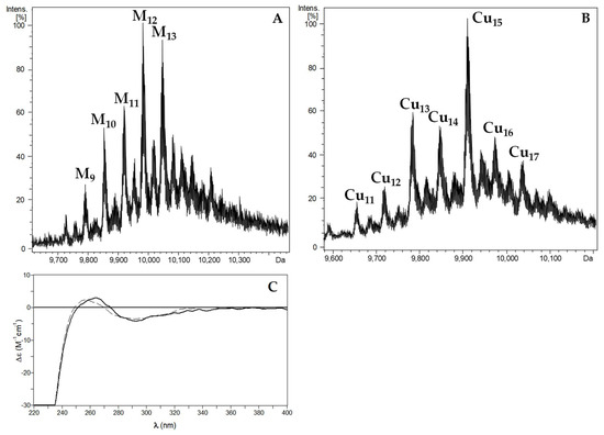 Metallothioneins (MTs) are usually small proteins known for their singularly high content of cysteine residues (Cys), which provide them the capacity for binding essential and non-essential heavy metal ions [1,2,3]. Since MT samples are natively found in association with metals their functions have been related with biological processes involving metal-binding [4]. Some organisms have achieved metal-specific functions of their MTs by harboring multiple forms, each one with a different metal preference [5,6]. Some gastropods, such as Cantareus aspersus (also known as Helix aspersa or Cornu aspersum) and Helix pomatia, for instance, exhibit different highly specific MTs devoted to selectively bind Cd(II) (CdMTs) or Cu(I) (CuMTs) [5,7]. Since the expression of CdMTs is upregulated by Cd2+ ions, these MTs have been associated with the physiological control of Cd, specifically with Cd detoxification [8,9,10], whereas the expression of CuMTs appears to be activated for controlling Cu homeostasis, which in the case of gastropods is related to the synthesis of the oxygen transporter hemocyanin [5,11].
