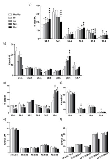 PI, the third most abundant lipid class (mean value of all groups 12.7%), was the lipid class showing the most robust alterations. PI was mainly composed of 38:4 (16.1–33.6%), 36:2 (15.5–19.0%), and 34:1 (8.2–14.0%) species (Figure 2c and Supplementary Table S3). The most consistent change was the significant increase in 38:4 (16.1% in healthy, 33.6% in AD, 30.1% in Neo, and 32.7% in Her), but there were also a significant decrease in saturated fatty acids, 32:0 (10.9% in healthy, 5.6% in AD, 6.6% in Neo, and 5.1% in Her) and 36:0 (10.0% in healthy, 5.2% in AD, 6.6 in Neo, and 5.1% in Her) species, and in MUFA species as 34:1 (14.0% in healthy, 8.9% in AD and Neo, and 8.2% in Her), and 36:1 (12.7% in healthy, 8.3% in AD, 8.9 in Neo, and 7.5% in Her).