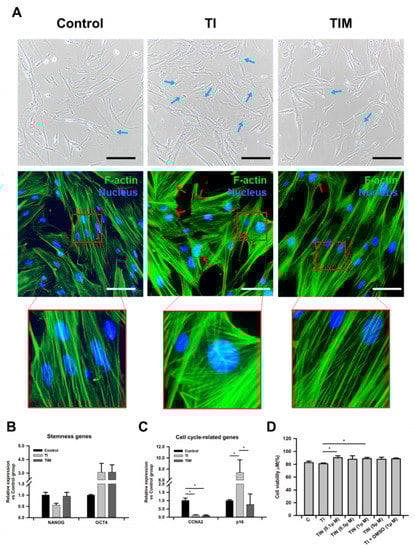 Characterization of hPD-MSCs. (A) Representative bright-field images (up) and fluorescence microscopy images of hPD-MSCs (down). Phalloidin for F-actin and Hoechst33342 for the nuclei were used to visualize the morphology of the hPD-MSCs. Blue arrows indicate abnormal MSCs that lost their thin and spindle-like shapes. Red arrows indicate disrupted, crisscrossed, and unorganized microfilaments vertical to the cell axis. Black scale bar, 200 μm, White scale bar, 100 μm. (B,C) Expression of cell cycle progression (CCNA2), cell cycle inhibitor (P16), and stemness (NANOG and OCT4) genes were determined using quantitative real-time PCR. (D) Cell viability was calculated by dividing the cells unstained with Trypan blue by the total number of cells. C: control, TI: TNF-α + IFN-γ, TIM: TNF-α + IFN-γ + MIT-001. Data are presented as the mean ± SEM (n = 3 for real-time qPCR data). Statistical significance was determined by a one-way ANOVA. * p < 0.05.