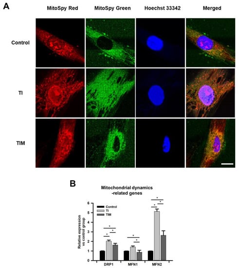 MIT-001 ameliorated mitochondrial function in hPD-MSCs. (A) Representative images of control, TNF-α/IFN-γ-exposed, and TNF-α/IFN-γ with MIT-001-treated hPD-MSCs. The mitochondrial membrane potential (red), mitochondrial mass (green), and nuclei (blue) of hPD-MSCs were stained and imaged using confocal microscopy. Scale bar, 20 μm. (B) Expression of the mitochondrial dynamics-related genes DPR1, MFN1, and MFN2 was analyzed using real-time qPCR. C: control, TI: TNF-α + IFN-γ, TIM: TNF-α + IFN-γ + MIT-001. Data are presented as the mean ± SEM (n = 3 for real-time qPCR data). Statistical significance was determined by a one-way ANOVA. * p < 0.05.