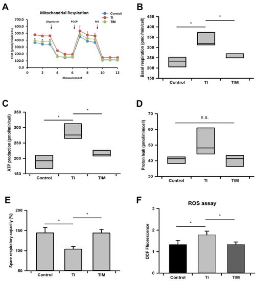 MIT-001 decreased mitochondrial metabolism of hPD-MSCs. (A) Comprehensive oxygen consumption rates in hPD-MSCs were measured using an extracellular flux analyzer. R/A: Rotenone/Antimycin. (B–E) Graphs of the basal respiration (B), ATP production (C), proton leak (D), and spare respiratory capacity (E). Cellular ROS levels were determined by measuring the fluorescence intensity of H2DCFDA after 488/555 excitation C: control, TI: TNF-α + IFN-γ, TIM: TNF-α + IFN-γ + MIT-001. Data are presented as the mean ± SEM (n = 3). Statistical significance was determined by a one-way ANOVA. * p < 0.05.
