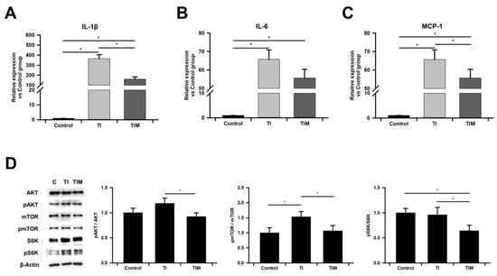 MIT-001 improved senescent phenotypes of hPD-MSCs. (A–C) Real-time qPCR results demonstrating the representative SASP expression levels of IL-1β, IL-6, and MCP-1. (D) Western blot analysis and phosphorylation ratios determined from the band intensities of anti-pAKT/anti-AKT, anti-pmTOR/anti-mTOR, anti-pS6K/anti-S6K, and the housekeeping protein β-actin in the control, TNF-α/IFN-γ -exposed, and TNF-α/IFN-γ with MIT-001-treated hPD-MSCs. C: control, TI: TNF-α + IFN-γ, TIM: TNF-α + IFN-γ + MIT-001. Data are presented as the mean ± SEM (n = 3). Statistical significance was determined by a one-way ANOVA. * p < 0.05.