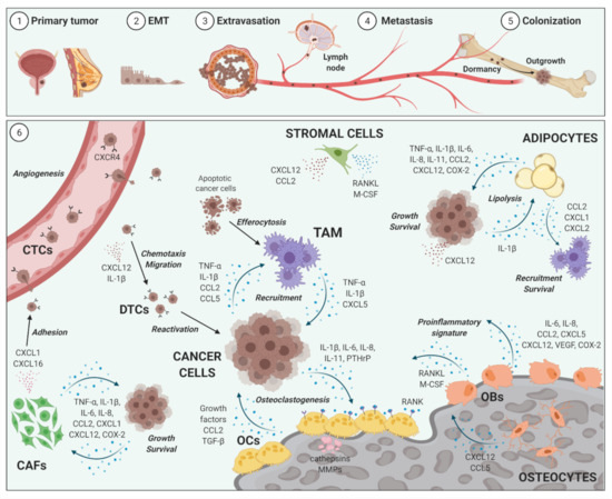 Breast cancer (BrCa); cancer-associated fibroblasts (CAFs); CC-chemokine ligand 2 (CCL2); CC-chemokine ligand 5 (CCL5); chemokine (C-X-C motif) ligand 8 (CXCL8); C-X-C motif chemokine 12 (CXCL12); C-X-C Motif Chemokine Receptor 4 (CXCR4); circulating tumor cells (CTCs); cyclooxygenase-2 (COX-2); danger-associated molecular pattern (DAMP); disseminated tumor cells (DTCs); epithelial-to-mesenchymal transition (EMT); extracellular matrix (ECM); hemopoietic stem cells (HSCs); interleukin-1β (IL-1β); interleukin-6 (IL-6); interleukin-8 (IL-8); interleukin-11 (IL-11); matrix metalloproteinase (MMP); mesenchymal stem cells (MSCs); monocyte chemoattractant protein-1 (MCP-1); multiple myeloma (MM); nuclear factor “kappa-light-chain-enhancer” of activated B-cells (NF-κB); osteoprotegerin (OPG); parathyroid hormone-related protein (PTHrP); pathogen-associated molecular pattern (PAMP); prostate cancer (PrCa); receptor activator of NF-κB ligand (RANKL); signal transducer and activator of transcription 3 (STAT3); skeletal-related event (SRE); stromal cell-derived factor 1 (SDF1); tumor-associated macrophages (TAM); transforming growth factor beta (TGF-β); tumor microenvironment (TME); tumor necrosis factor alpha (TNF-α); vascular endothelial growth factor (VEGF).