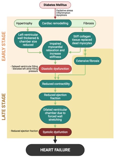 Events in the development and progression of diabetic cardiomyopathy (DCM) initiated by diabetes-induced uncontrolled cardiac remodeling. The early stage of DCM mainly characterized by diastolic dysfunction will progress to late stage as systolic dysfunction appears, eventually leading to heart failure.