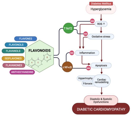 Flavonoids are the most common occurring plant phenolic compounds [11]. On average, flavonoids are consumed daily from diet at approximately 400 mg/kg aglycone equivalent (AE). They have been reported to exhibit diverse therapeutic potential in medicine and other biological activities [12,13,14]. The potential of flavonoids in alleviating diabetic cardiomyopathy or other cardiovascular complications derived from diabetes have been commonly related with their remedial actions as anti-hyperglycemic [15], anti-hyperlipidemic [16], antioxidant [17], anti-inflammatory [18], and anti-apoptotic [19] agents. Considering the promising potential of flavonoids in combating diabetic cardiomyopathy development, we aimed to review the potential mechanisms that flavonoids and their subclasses target in order to exert their cardioprotective potential.