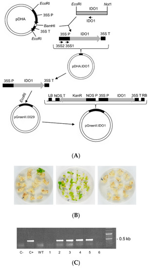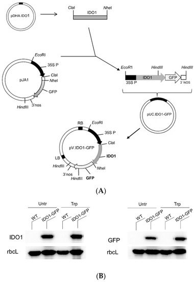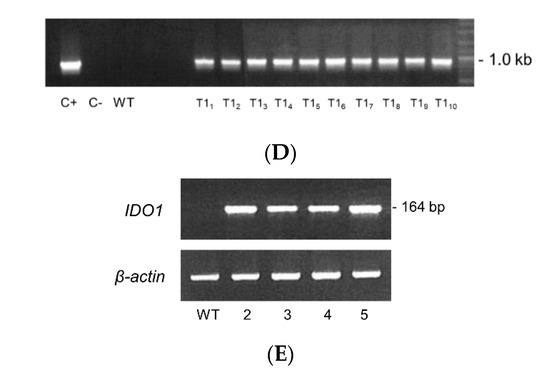 2.1. Cloning of IDO1 cDNA in a Plant Expression Vector and Attempted Stably Expression in Tobacco Plants