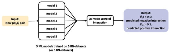 In the present paper, we discuss two types of problems that we solve using ML algorithms: first, the prediction of new pairs of interacting molecules and proteins, which we call DTI (Drug-Target Interaction) prediction, and second, the identification of new targets for a given drug. The former is only discussed in Section 3.1, where DTI prediction is used to evaluate the overall prediction capabilities of ML algorithms, and to determine the distribution of the prediction scores of positive and negative DTI, respectively. We used these distributions to determine thresholds for the latter problem, i.e., target identification for a given drug, which is the central topic of the paper. Figure 2 illustrates the pipeline for DTI prediction: 5 ML models are trained on 5 RN-datasets (or 5 BN-datasets), providing 5 interaction scores for each new pair. These 5 scores are averaged to provide a final score. Figure 3 illustrates the pipeline for target identification: for each new drug d, 2670 pairs are formed between this drug and each of the 2670 proteins p present in the DB-Database. DTI prediction is performed for each pair, as described above and illustrated on Figure 2. This provides a mean score of interaction with this drug for each of the 2670 proteins, which are then ranked accordingly. The candidate targets for this drug are the top ranked proteins with a score above a given threshold.