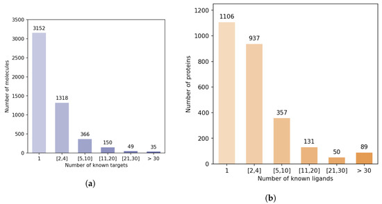 The DrugBank database [15] is a widely used bio-activity database. While much smaller than PubChem or ChEMBL, it provides high-quality information for approved and experimental drugs along with their targets. It contains around 15,000 curated DTIs involving 2670 human proteins (this set of proteins can be viewed as the “druggable” human proteome), and 5070 druglike molecules, corresponding to the DB-Database described in Section 2.1. This database is relevant for training of ML models for DTI predictions involving human proteins and drug-like molecules. However, Figure 5 shows that there is a strong discrepancy between the number of known ligands per protein, or known protein targets per molecule.