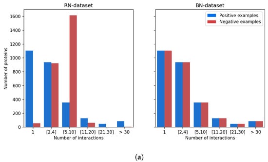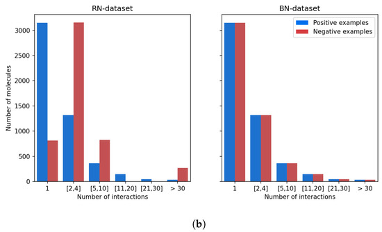 Balancing the BN-datasets. (a) Distribution of the proteins according to the number of positive examples or negative examples in which they are involved. (b) Distribution of the molecules according to the number of positive examples or negative examples in which they are involved.