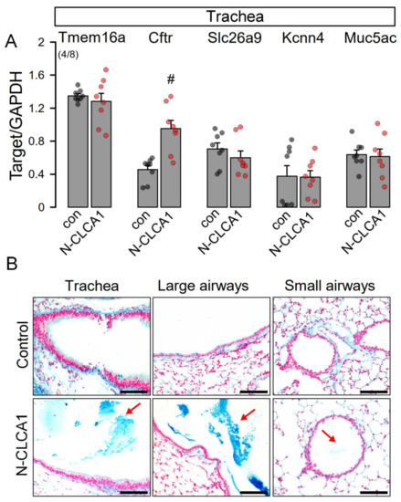 N-CLCA1 increases mucus production in vivo. (A) Semiquantitative RT-PCR analysis of the expression of MUC5AC, TMEM16A, CFTR, SLC26A9 and KCNN4 in isolated tracheal epithelial cells from control mice and mice treated for 24 h with N-CLCA1. Mean ± SEM (number of animals/number of reactions). #—significant difference when compared to control or mock (p < 0.05; unpaired t-test). (B) Alcian blue staining indicating enhanced mucus secretion in airways exposed to N-CLCA1. Bar = 100 µm.