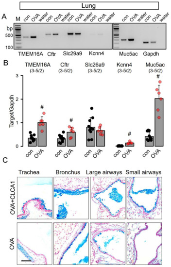 N-CLCA1 enhances mucus secretion in asthmatic mouse lungs in vivo. (A,B) Semiquantitative RT-PCR analysis of the expression of Tmem16a, Cftr, Slc26a9 and Kcnn4, and Muc5ac in lungs from control mice and OVA-treated mice. Expression of Tmem16a, Cftr, Kcnn4, and Muc5ac is enhanced in asthmatic (OVA) mice. Mean ± SEM (number of animals/number of experiments). #—significant difference when compared to control (p < 0.05; unpaired t-test). (C) Alcian blue staining of airways from OVA-sensitized mice treated with N-CLCA1 (upper panel) and OVA-sensitized mice without additional treatment with N-CLCA1 (lower panel). N-CLCA1 induced additional secretion of mucus with enhanced accumulation of the mucus in central and peripheral airways. Bar = 100 µm.