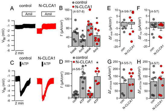 N-CLCA1 does not induce additional Ca2+-activated Cl− secretion in mouse tracheas. (A,B) Original Ussing chamber recording of the transepithelial voltages measured in mouse trachea under open circuit conditions and summary of the calculated equivalent short circuit current (Isc’). No significant changes in amiloride-sensitive (10 µM) Na+ absorption was detected by 24 h exposure to N-CLCA1. (C,D) No significant changes in ATP (luminal; 100 µM)—induced negative voltage deflection and ATP-activated Isc’ was detected by N-CLCA1. (E,F) N-CLCA1 did not induce an effect of Ani9 (10 µM) or TRAM-34 (100 nM) on basal currents. (G,H) Effects of ATP in the presence of luminal Ani9 or basolateral TRAM-34 (T34) were independent of N-CLCA1. Mean ± SEM (number of animals/number of experiments). *—significant effect of amiloride and ATP (p < 0.05; paired t-test).