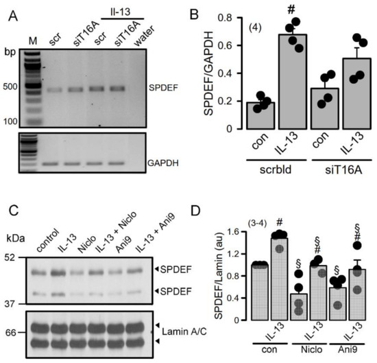 RT-PCR analysis of SPDEF expression in Calu3 cells indicated upregulation by incubation with the cytokine IL-13 (Figure 5A,B). siRNA knockdown of TMEM16A inhibited upregulation of SPDEF by IL-13 suggesting a role Of TMEM16A for expression of SPDEF. Similar inhibition of SPDEF expression by siTMEM16A was observed by Western blotting of SPDEF protein (upper and lower bands indicate glycosylated and nonglycosylated protein, respectively) (Figure 5C). Moreover, densitometric quantification of the Western blots also indicated inhibition of SPDEF expression by the TMEM16A inhibitors niclosamide and Ani9 (Figure 5D). Taken together, TMEM16A expression and function controls expression of the master switch for goblet cell metaplasia, SPDEF [28,29,30].