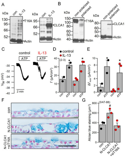 CLCA1-induced mucus production in polarized BCi-NS1 cells is TMEM16A-dependent. A,B) Western blot indicating upregulation of CLCA1 expression in BCi-NS1 cells exposed to IL-13 (20 ng/mL). Expression of TMEM16A was found to be attenuated in polarized grown cells (filter-grown ALI-cultures), when compared to nonpolarized (plastic-grown) cells. In contrast, CLCA1 expression was upregulated in ALI cultures. (number of experiments). (C,D) IL-13 does not enhance ATP-induced (100 µM) negative voltage deflections and activation of short circuit currents (Isc). Activation of Isc was fully transient, i.e., the current returned to the baseline. (E) The effect of the TMEM16A inhibitor Ani9 (10 µM) is not enhanced in IL-13 treated cells. (F,G) Individual examples and quantification of alcian blue staining in polarized BCi-NS1 cells under control conditions, after exposure to N-CLCA1 or in cells treated with N-CLCA1 and siTMEM16A. Mucus expression is enhanced in N-CLCA1-treated cells, but the effect of N-CLCA1 is blocked after knockdown of TMEM16A. (number of experiments). Scale bar = 50 µm. Mean ± SEM. # significant difference when compared to control (p < 0.05; unpaired t-test). * significant activation by ATP (p < 0.05; paired t-test).