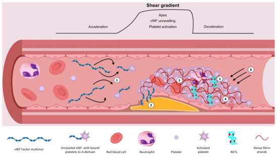 - Fu, H.; Jiang, Y.; Yang, D.; Scheiflinger, F.; Wong, W.P.; Springer, T.A. Flow-induced elongation of von Willebrand factor precedes tension-dependent activation. Nat. Commun. 2017, 8, 324. [Google Scholar] [CrossRef]