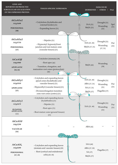 Growing attention has been devoted in the last years to the investigation of the CuAO expression pattern during development and in response to an array of stress and stress-related hormones. To this purpose, tissue-specific expression analysis and quantitative expression studies have been performed exploiting AtCuAOs promoter::green fluorescent protein-β-glucuronidase fusion (GFP-GUS) transformed Arabidopsis plants and RT-qPCR approaches. In Arabidopsis seedlings at early developmental stage, AtCuAO promoter activity was revealed in tissues involved in water supply and/or water loss such as hydathodes, stomata and vascular tissues as well as in growing tissues responsible for organ development and growth rate modulation. Expression has been found in hydathodes of expanding leaves (AtCuAOγ1 and AtCuAOγ2 [21]) and/or cotyledons (AtCuAOα2, AtCuAOγ1 and AtCuAOγ2 [21]); in stomata of cotyledons (AtCuAOβ [38]; AtCuAOζ [20]) and flowers (AtCuAOβ [38]) as well as in vascular tissues of (i) cotyledons, expanding leaves and hypocotyl (AtCuAOγ1 [21]); (ii) hypocotyl, hypocotyl/root junction and root mature zone (AtCuAOα3 [21]); (iii) root transition, elongation, and maturation zones (AtCuAOβ [39]); (iv) cotyledons and expanding leaves (AtCuAOζ [40]). Moreover, AtCuAO expression has been found in cotyledon external border and in expanding leaves (AtCuAOα2 [21]); in stipules (AtCuAOα3 and AtCuAOγ2 [21]); in the cortex of the division/elongation transition root zone (AtCuAOγ1 [21]); root apex (AtCuAOβ and AtCuAOγ2 [21]); ground tissues of root mature zone (AtCuAOγ2 [21]); root cortical end endodermal cells (AtCuAOζ [40]) (Figure 1).
